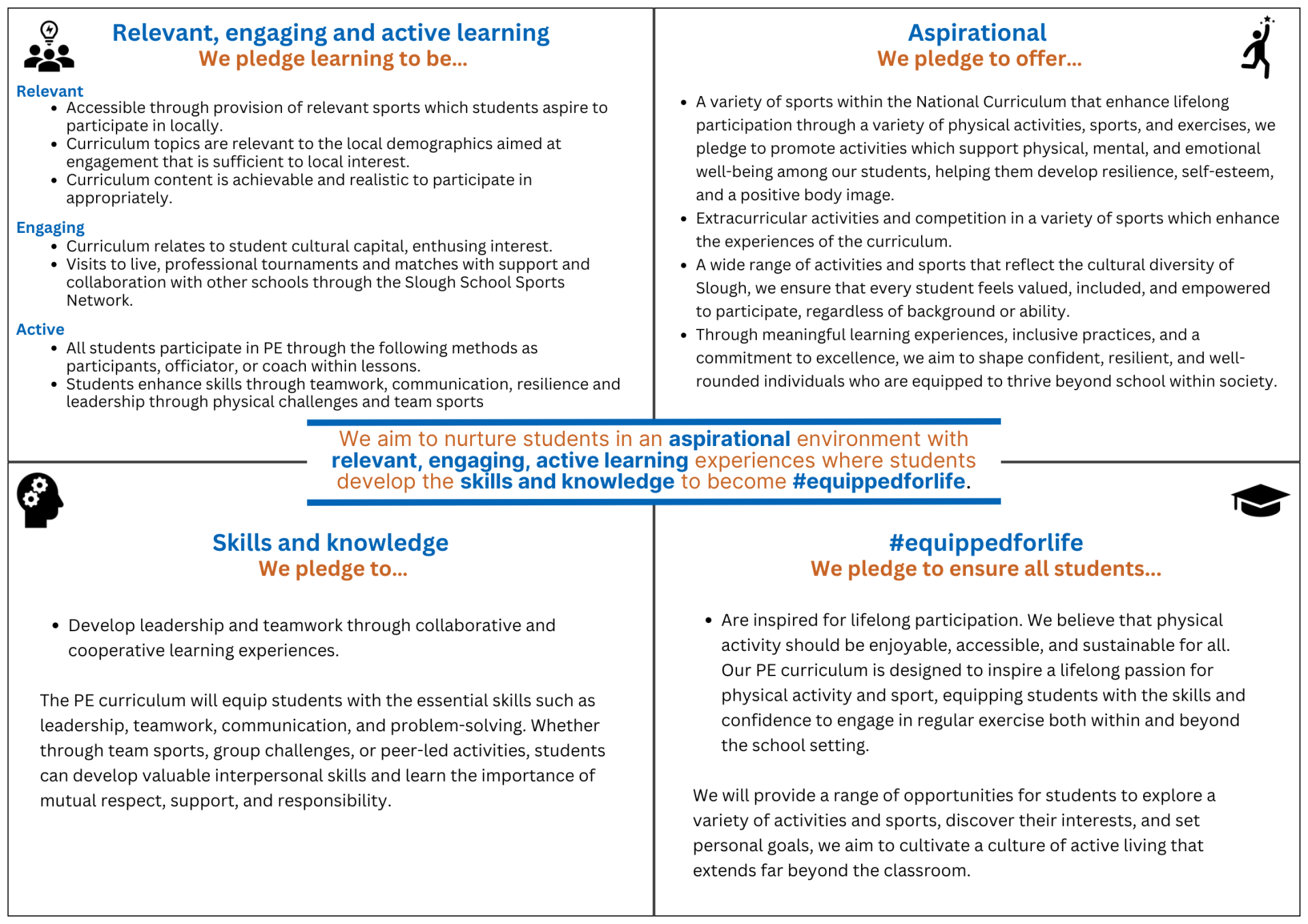 The PE curriculum and the extracurricular activities offered, reflect existing strengths of the student body. Performance is encouraged, with many opportunities for students to compete within lessons and against other schools, allowing students to experience success and failure in a competitive environment, both individually and as part of a team. There are existing links with local clubs to provide further opportunities for participation.