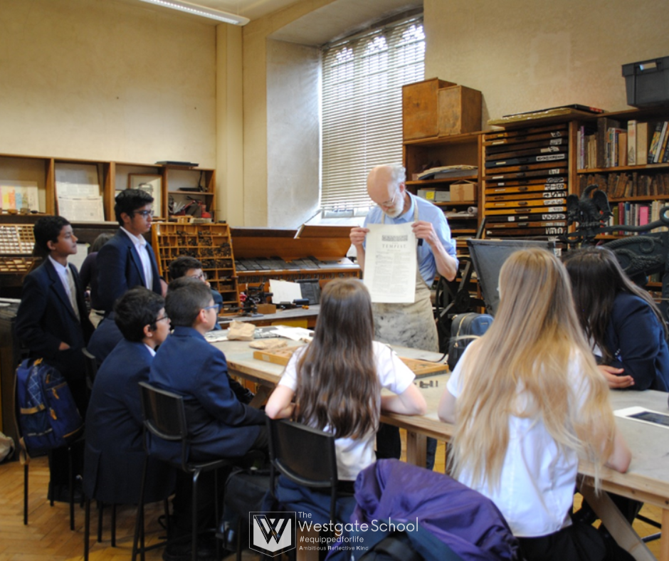 On Monday, 10 June, Ms Mulligan and Mrs Mansbridge took 14 students to Oxford for a visit with the Bodleian Libraries education team. In the university's printing room, they learnt how books had been printed for centuries, handled printing materials, and experienced the craft and labour involved in creating a printed book. After selecting and arranging letters for print, students were able to use the historic letterpress printing equipment to make a keepsake to print and take home. Students also printed an exact replica of the first page of the Tempest from Shakespeare's first folio.