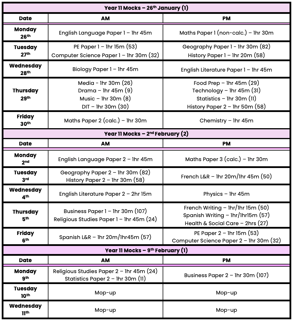 Year 11 January/February Mock Timetable - 2026